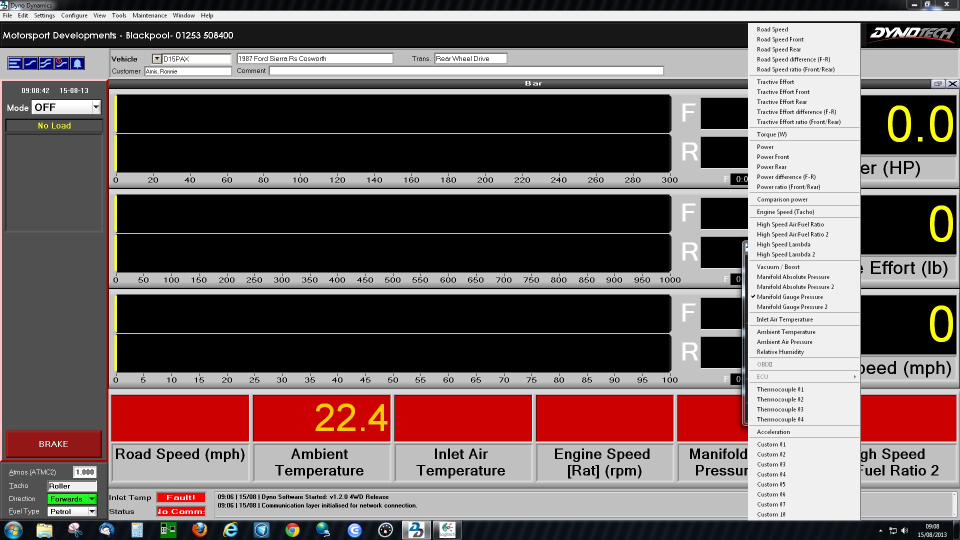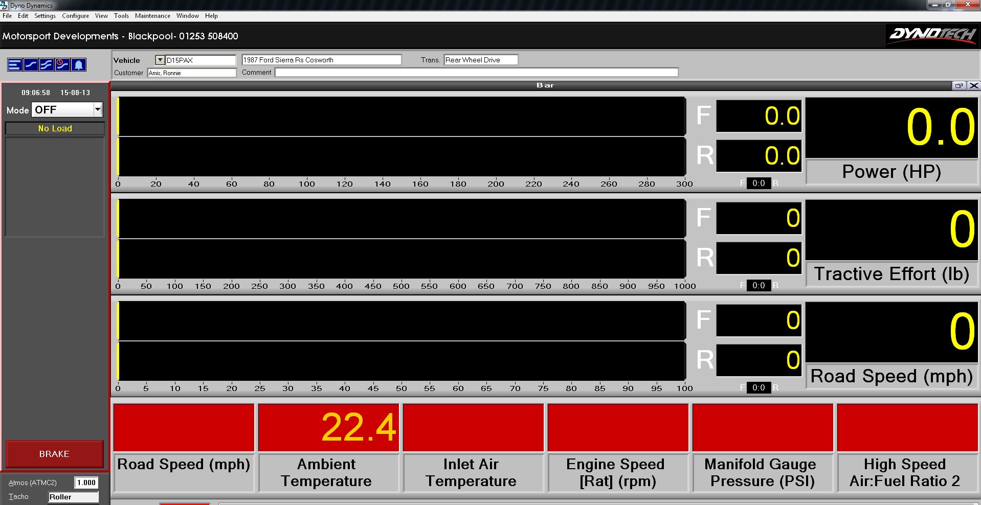 The mapper can control engine speed, while the driver controls engine load with his right foot. I just press the arrow key to go up X rpm or MPH, let it stabilise for a second, tweak the fuel or spark table for AFR / Tractive effort to my requirements then hit the arrow key to move to the next load /speed site I desire. 3000/3250/3500/4000rpm for example. If I want more load, James just presses the pedal further. The dyno wont allow engine acceleration, so load increases. Simple, and very effective. This dyno has an instant response time too, unlike others I have used where its measured in many seconds.