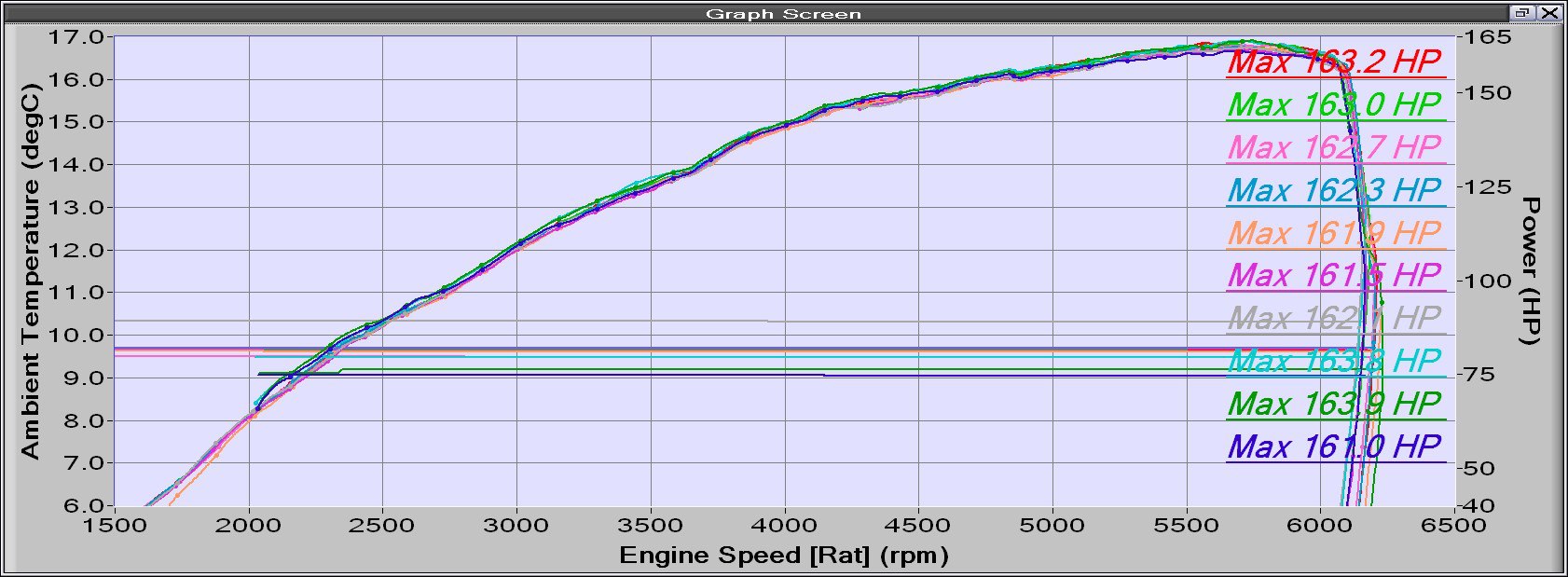 I then did ten runs back to back and monitored the cell ambient temperature on the graph to see how much heat is added to the cell during ten back to back flat out runs at 180bhp. Then, we looked at all the graphs overlaid on top of each other for the results.