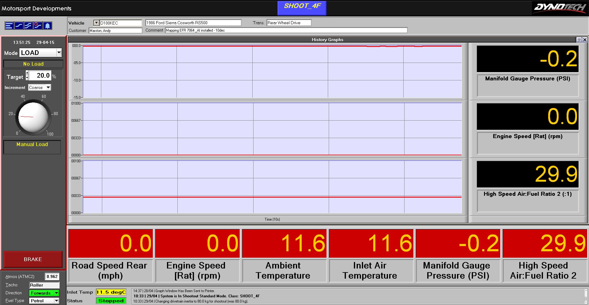 The mapper can control engine speed, while the driver controls engine load with his right foot. I just press the arrow key to go up X rpm or MPH, let it stabilise for a second, tweak the fuel or spark table for AFR / Tractive effort to my requirements then hit the arrow key to move to the next load /speed site I desire. 3000/3250/3500/4000rpm for example. If I want more load, James just presses the pedal further. The dyno wont allow engine acceleration, so load increases. Simple, and very effective. This dyno has an instant response time too, unlike others I have used where its measured in many seconds.